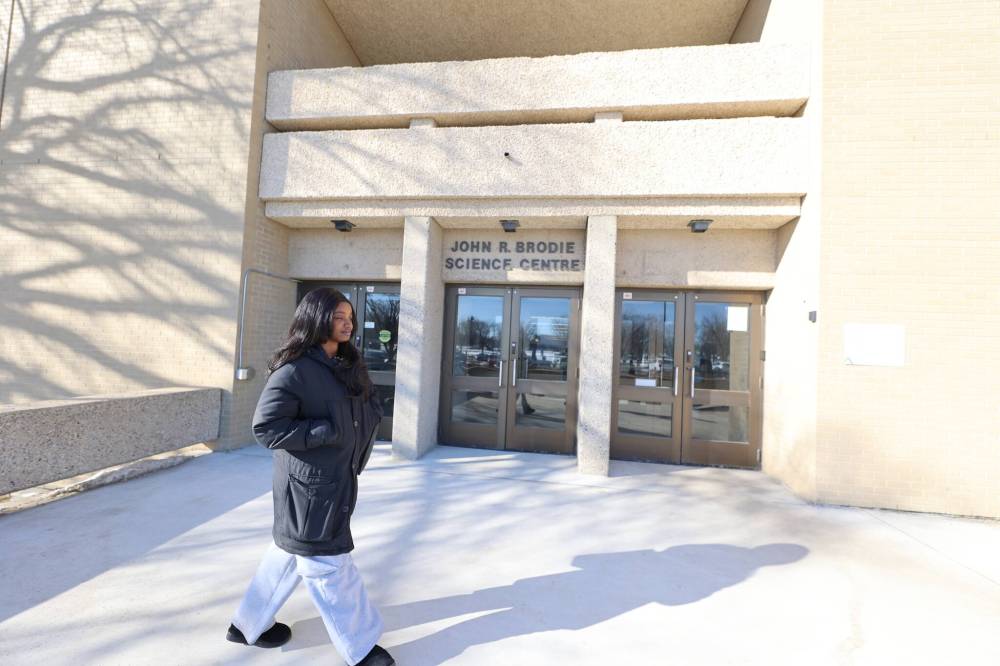 Brandon University student Sophia Dande-Ayasuk walks in front of the Brodie Science Centre on Friday afternoon. (Abiola Odutola/The Brandon Sun)