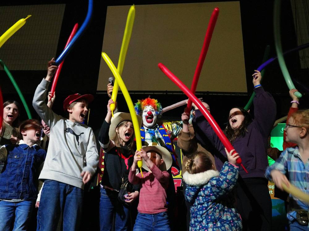 Doodles the Clown waves balloon sticks and sings alongside children on stage during a magic show at the winter fair on Monday. (Weichen Zhang/The Brandon Sun)