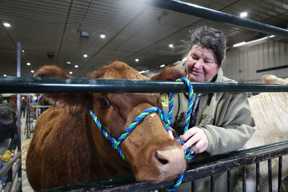 Kerri Hinsburg, chair of the Royal Manitoba Winter Fair Cattle Show, ties up Cupcake as part of preparations for Thursday's grooming show. (Alex Lambert/The Brandon Sun)