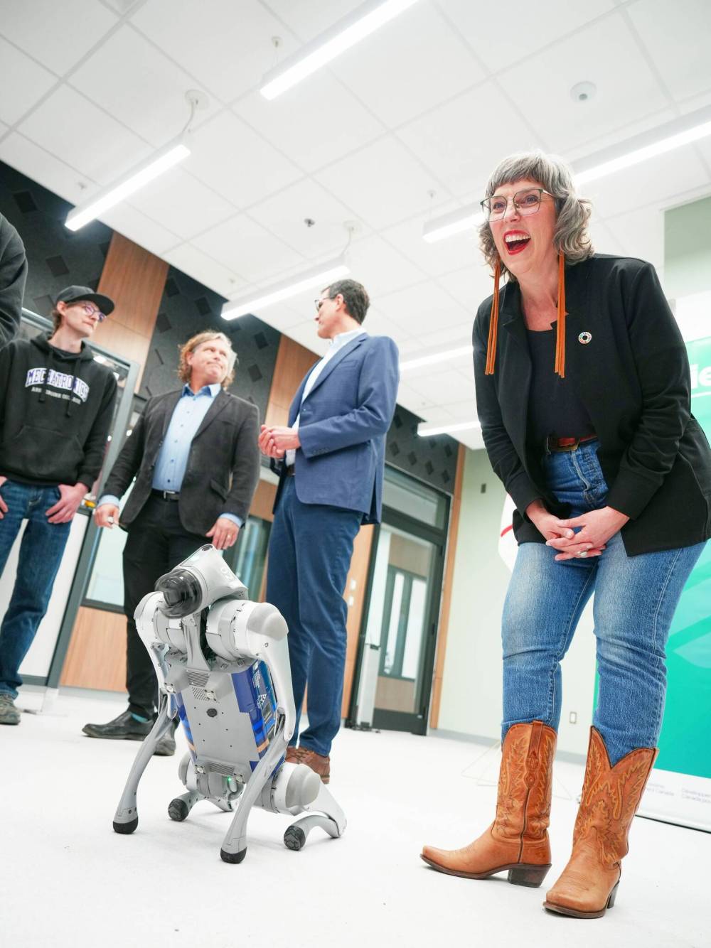Ginette Lavack, MP for St. Boniface-St.Vital, reacts with delight as robotic dog Otto performs during Thursday’s news conference. (Weichen Zhang/The Brandon Sun)