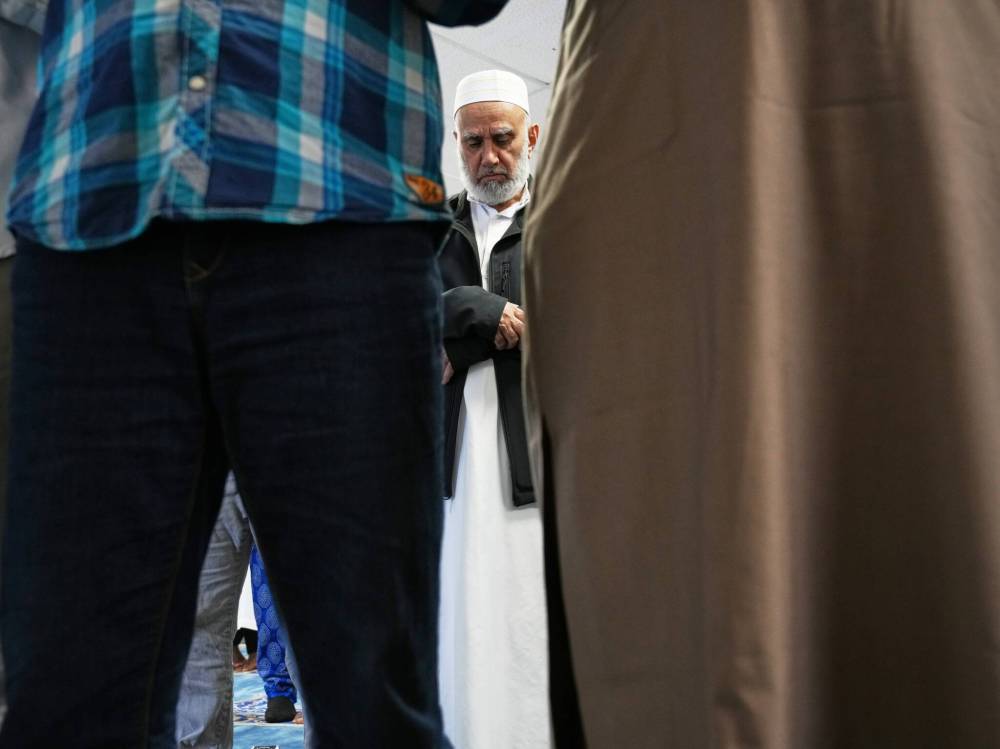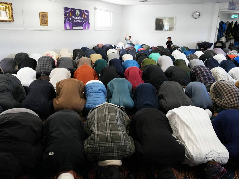 Worshippers bow during Friday prayers at the Brandon Islamic Centre.