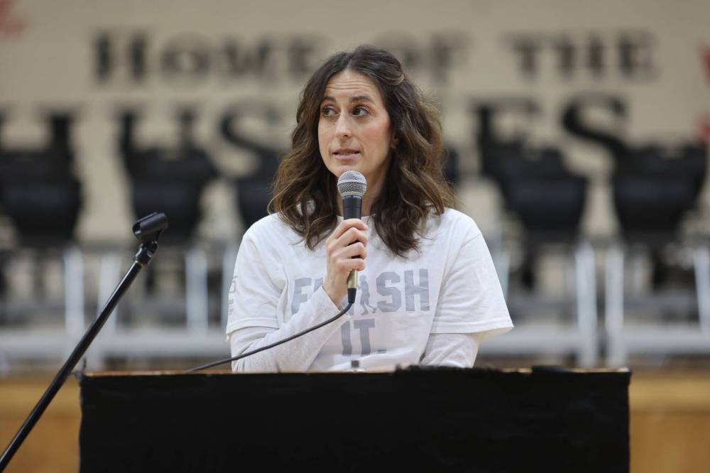 LEFT: Hamiota Collegiate Institute principal Beccy Ardiel speaks to students and introduces Fred Fox at the school event on Thursday. RIGHT: A crowd of students listens to Fred Fox speak during Thursday’s presentation.