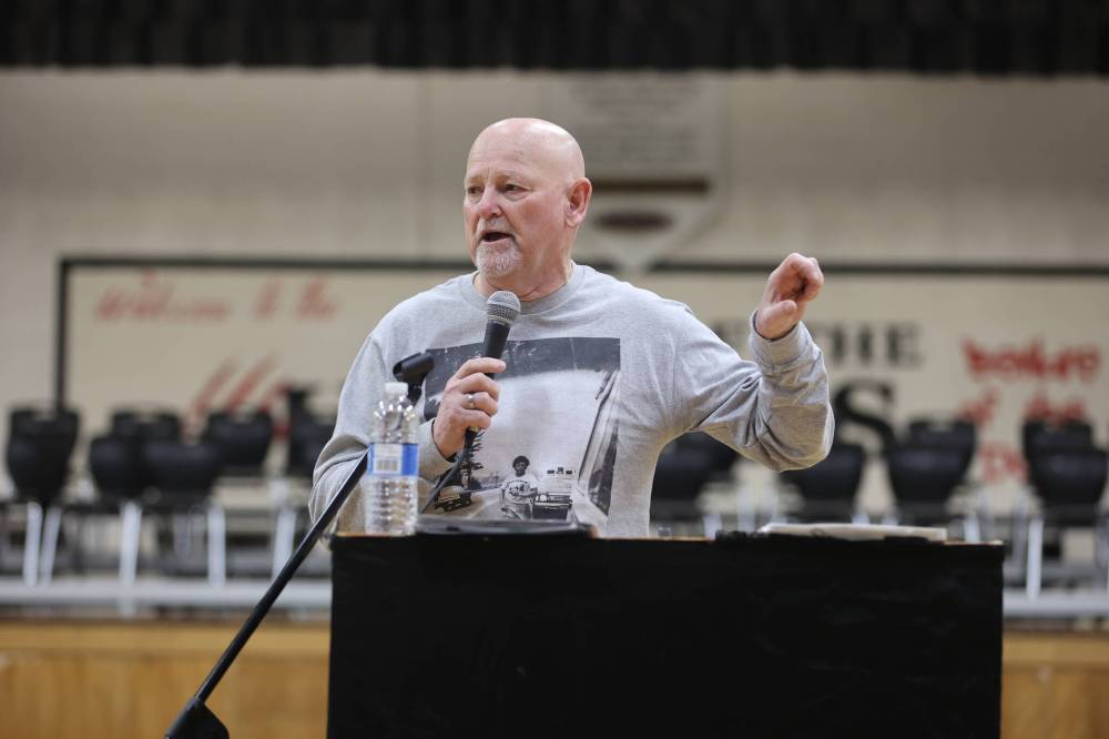 Fred Fox, older brother of Canadian icon Terry Fox, speaks to students during a presentation at Hamiota Collegiate Institute on Thursday. (Photos by Alex Lambert/The Brandon Sun)