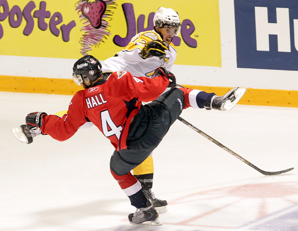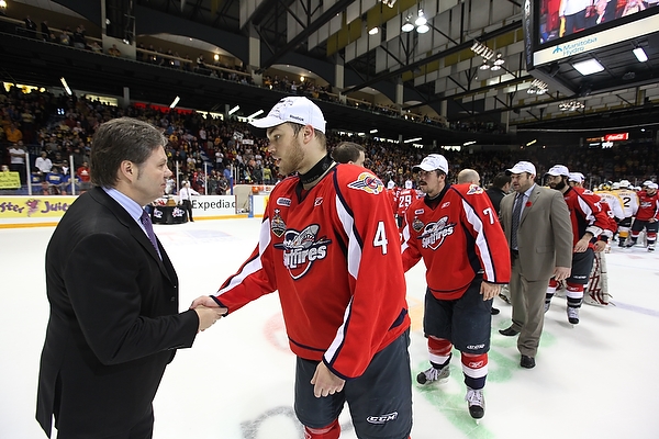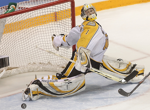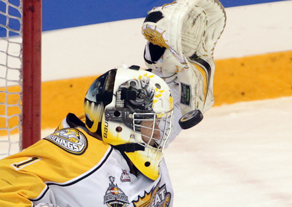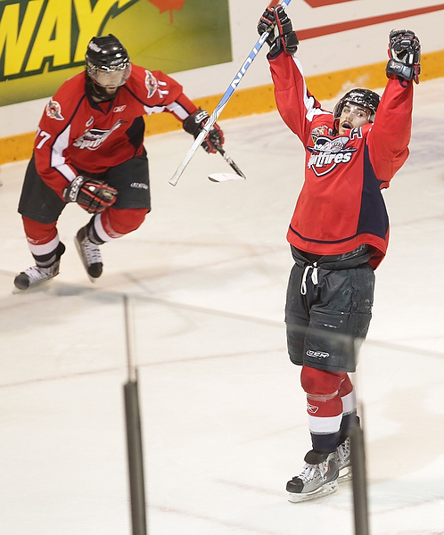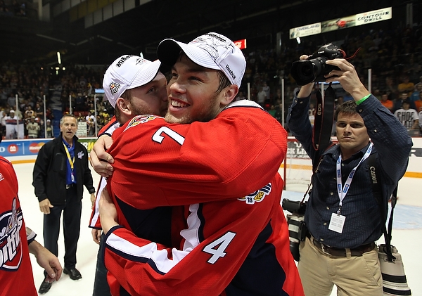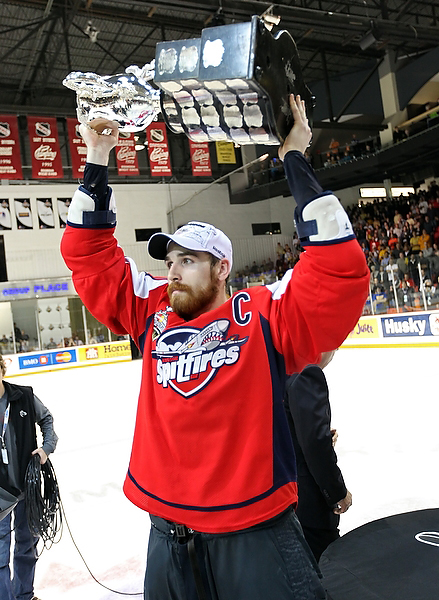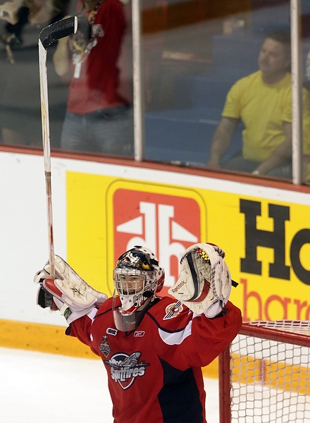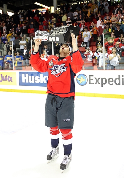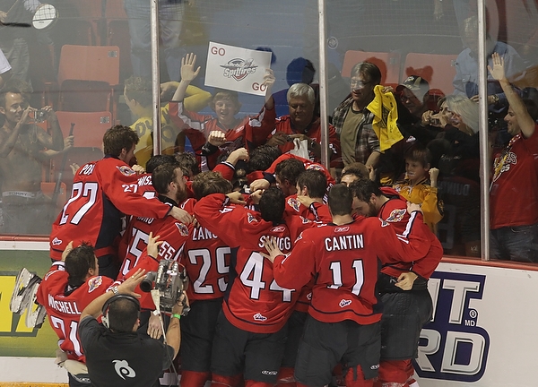 Eric Wellwood #67 of the Windsor Spitfires celebrates after scoring during the first period of the Mastercard Memorial Cup Championship against the Brandon Wheat Kings at Westman Place in Brandon on Sunday, May 23, 2010. (Tim Smith/Brandon Sun)MVP Taylor Hall #4 of the Windsor Spitfires hugs teammate Adam Wallace #7 after the Spitfires won the 2010 Mastercard Memorial Cup at Westman Place on Sunday, May 23, 2010. (Tim Smith/Brandon Sun)Matt Calvert #11 and Shayne Wiebe 17 of the Brandon Wheat Kings celebrate Calvert's goal during the second period of the Mastercard Memorial Cup Championship against the Windsor Spitfires at Westman Place in Brandon on Sunday, May 23, 2010. (Tim Smith/Brandon Sun)Brandon Wheat Kings fans cheer from behind the Windsor Spitfires bench after a goal by the Wheaties Matt Calvert #11 during the second period of the Mastercard Memorial Cup Championship at Westman Place in Brandon on Sunday, May 23, 2010. (Tim Smith/Brandon Sun)The puck sails past goalie Jacob DeSerres #1 of the Brandon Wheat Kings for a goal by Dale Mitchell #71 of the Windsor Spitfires during the third period of the 2010 Mastercard Memorial Cup at Westman Place on Sunday, May 23, 2010.The puck sails past goalie Jacob DeSerres #1 of the Brandon Wheat Kings for a goal by Dale Mitchell #71 of the Windsor Spitfires during the third period of the 2010 Mastercard Memorial Cup at Westman Place on Sunday, May 23, 2010.Goaltender Jacob DeSerres comes face-to-face with the puck while making a save during the 2010 Mastercard Memorial Cup at Westman Place on Sunday, May 23, 2010.Matt Calvert #11 of the Brandon Wheat Kings hammers Ryan Ellis #6 of the Windsor Spitfires during the third period of the 2010 Mastercard Memorial Cup at Westman Place on Sunday, May 23, 2010. (Tim Smith/Brandon Sun)The Brandon Wheat Kings watch the clock run out on their 9-1 loss to the Windsor Spitfires in the 2010 Mastercard Memorial Cup championship at Westman Place on Sunday, May 23, 2010. (Tim Smith/Brandon Sun)Goalie Phillipp Grubauer #33 of the Windsor Spitfires throws up his arms in celebration as the time runs out in the 2010 Mastercard Memorial Cup at Westman Place on Sunday, May 23, 2010. (Tim Smith/Brandon Sun)The Windsor Spitfires mob goalie Phillipp Grubauer #33 in celebration after winning the 2010 Mastercard Memorial Cup at Westman Place on Sunday, May 23, 2010. (Tim Smith/Brandon Sun)MVP Taylor Hall #4 of the Windsor Spitfires shakes hands with Brandon Wheat Kings head coach Kelly McCrimmon after the Spitfires won the 2010 Mastercard Memorial Cup at Westman Place on Sunday, May 23, 2010. (Tim Smith/Brandon Sun)MVP Taylor Hall #4 of the Windsor Spitfires hugs teammate Adam Wallace #7 after the Spitfires won the 2010 Mastercard Memorial Cup at Westman Place on Sunday, May 23, 2010. The Spitfires defeated the Brandon Wheat Kings by a score of 9-1. (Tim Smith/Brandon Sun)Captain Harry Young #55 of the Windsor Spitfires hoists the Memorial Cup trophy after the Spitfires won the 2010 Mastercard Memorial Cup at Westman Place on Sunday, May 23, 2010. (Tim Smith/Brandon Sun)MVP Taylor Hall #4 of the Windsor Spitfires kisses the Memorial Cup trophy after the Spitfires won the 2010 Mastercard Memorial Cup at Westman Place on Sunday, May 23, 2010. (Tim Smith/Brandon Sun)Colin Corneau/Brandon Sun