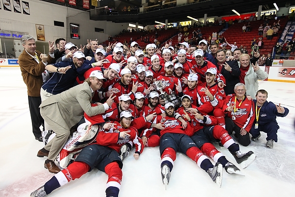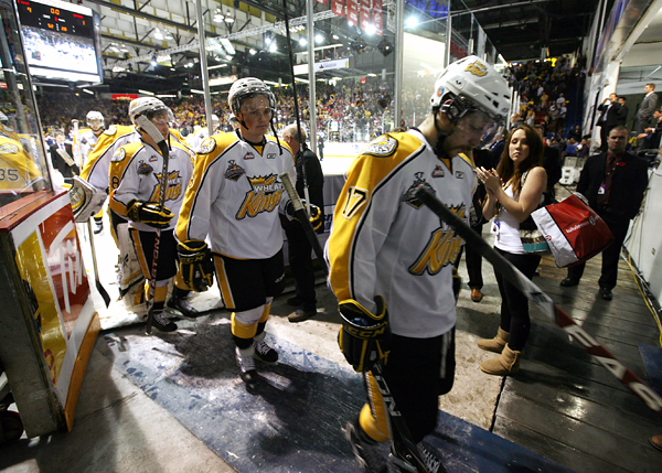 The Brandon Wheat Kings exit the arena after their 9-1 loss to the Windsor Spitfires in the Memorial Cup final, Sunday evening at Westman Place.The Windsor Spitfires pose for a team photo after winning the 2010 Mastercard Memorial Cup at Westman Place on Sunday, May 23, 2010. The Spitfires defeated the Brandon Wheat Kings by a score of 9-1. (Tim Smith/Brandon Sun)