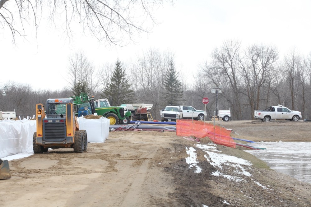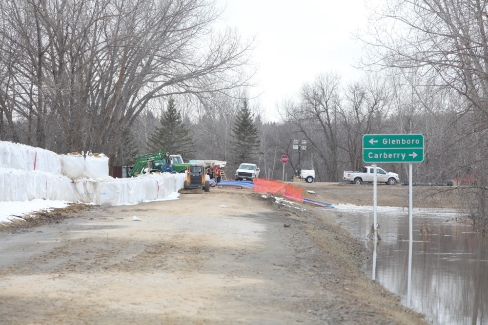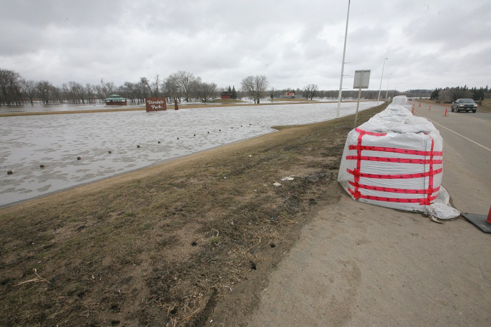 Sandbags create a dike along the campground road in Spruce Woods Provincial Park at the edge of the swollen Assiniboine River on Monday. Workers were busy on Monday fighting the floodwaters at the Seton Bridge where Highway 5 crosses the Assiniboine in the park.Tim Smith/Brandon Sun