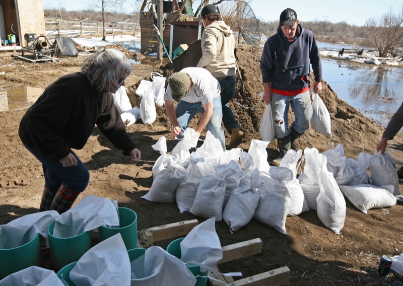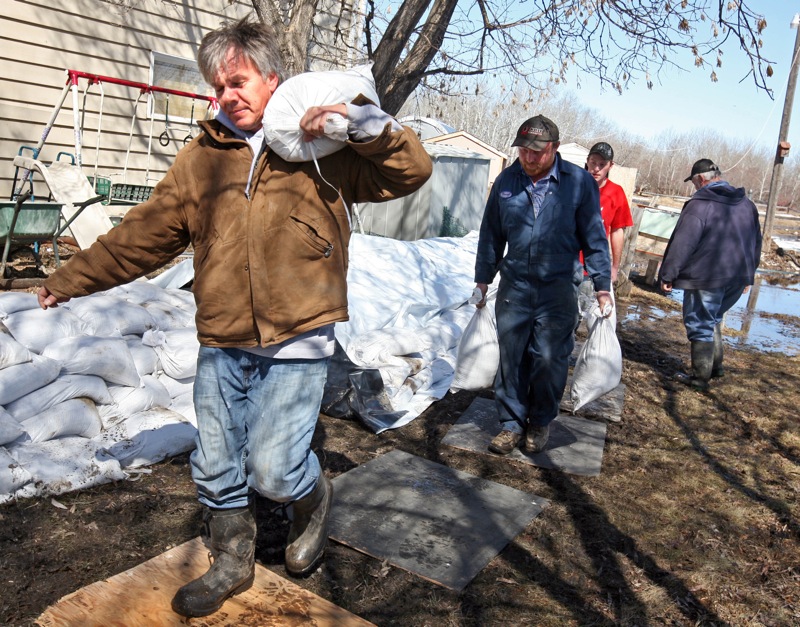 Volunteers work to place sandbags around a home in the Rural Municipality of Cornwallis to protect against rising river levels, Tuesday afternoon.Bruce Bumstead/Brandon Sun