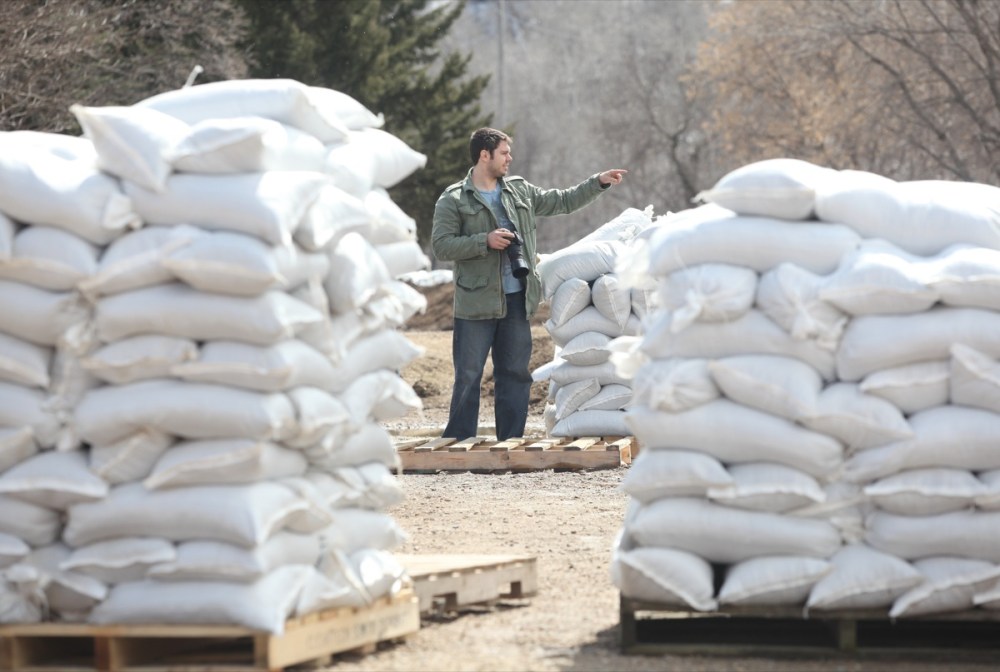 Colin Blyth of Brandon is framed by pallets of sandbags as he surveys the Souris River level at the edge of the Wawanesa School parking lot in Wawanesa with friend Mike Farquhar (not shown) on Monday. Blyth and Farquhar are kayakers and were scouting out areas to kayak when the river levels drop. A dike has been built around the Wawanesa school to protect it from flooding.Tim Smith/Brandon Sun