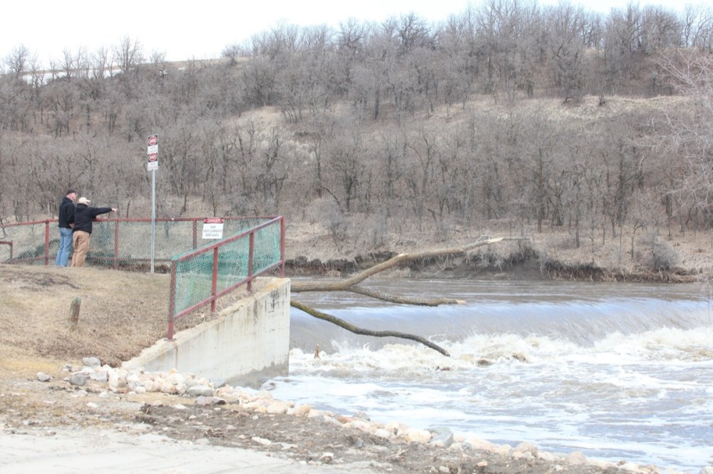 Onlookers watch as water from the swollen Souris River rages over the dam in Wawanesa on Monday.Tim Smith/Brandon Sun