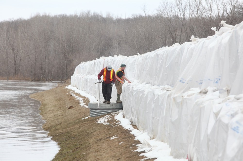 Provincial Parks workers open a control gate along a line of sandbags creating a dike along the campground road in Spruce Woods Provincial Park at the edge of the swollen Assiniboine River on Monday. Workers were busy on Monday fighting the floodwaters at the Seton Bridge where Highway 5 crosses the Assiniboine in the park.Tim Smith/Brandon Sun