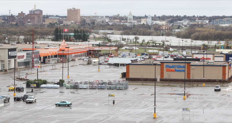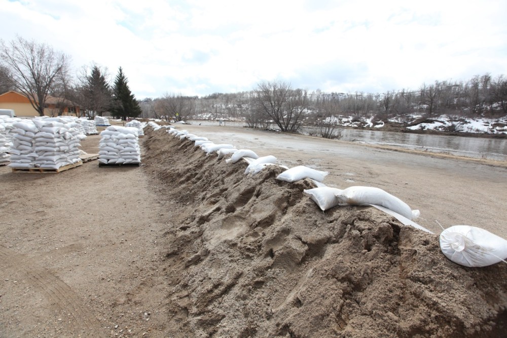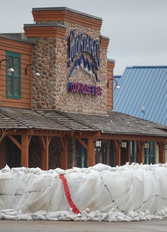A wall of super sandbags for a barrier ahead Montana's Cookhouse in the Corral Centre on Tuesday in preparation of breach in the main dike along 18th Street North.