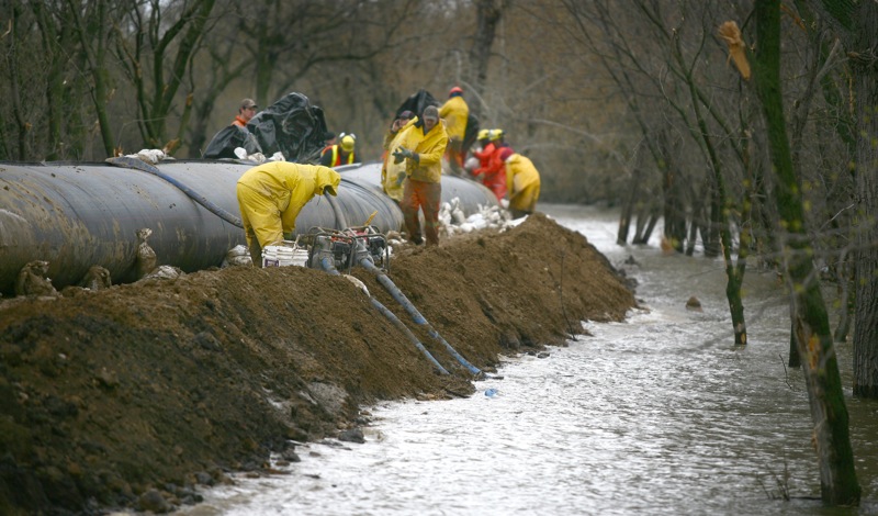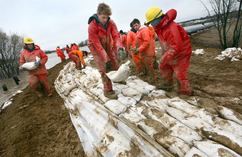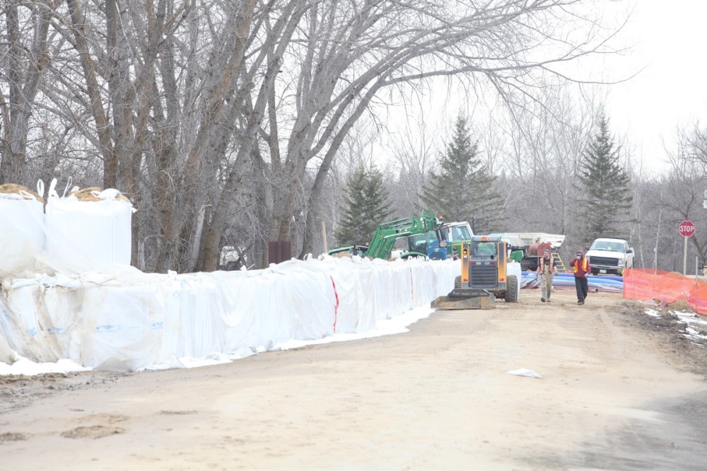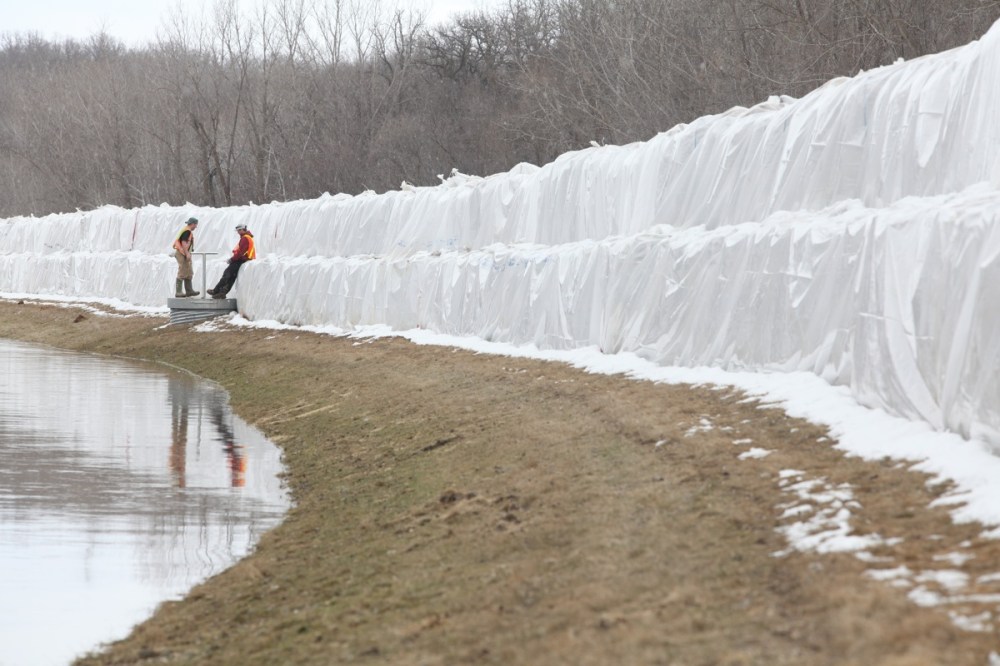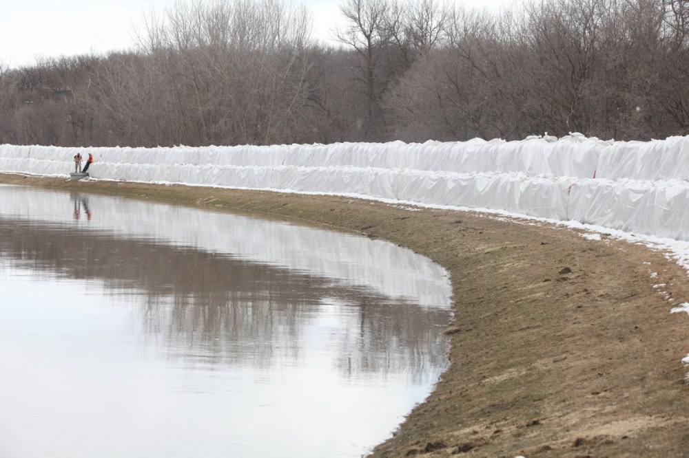 City crews, along with firefighters with Manitoba Conservation, work at topping up the the southern dike with Aqua Dams in preparation of the crest on the Assiniboine River on Tuesday.Bruce Bumstead/Brandon Sun
