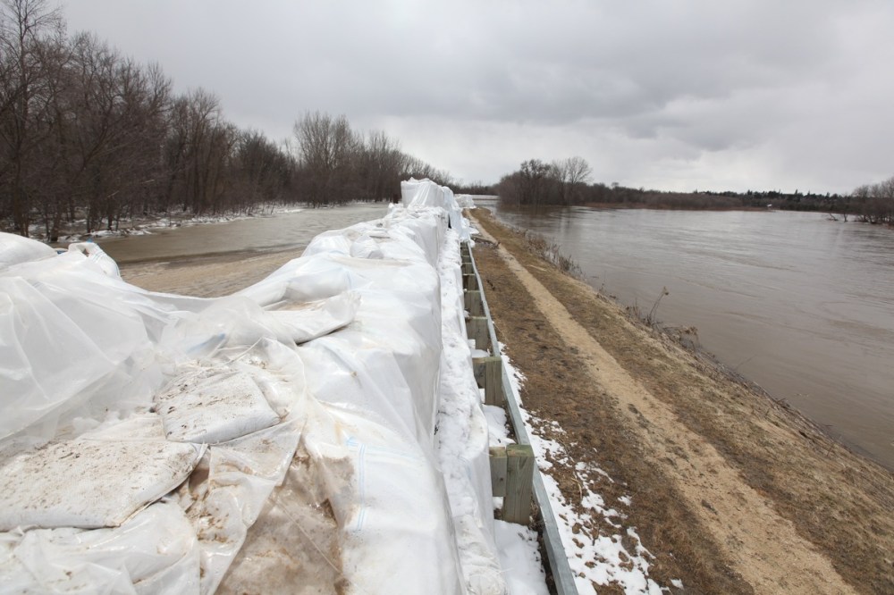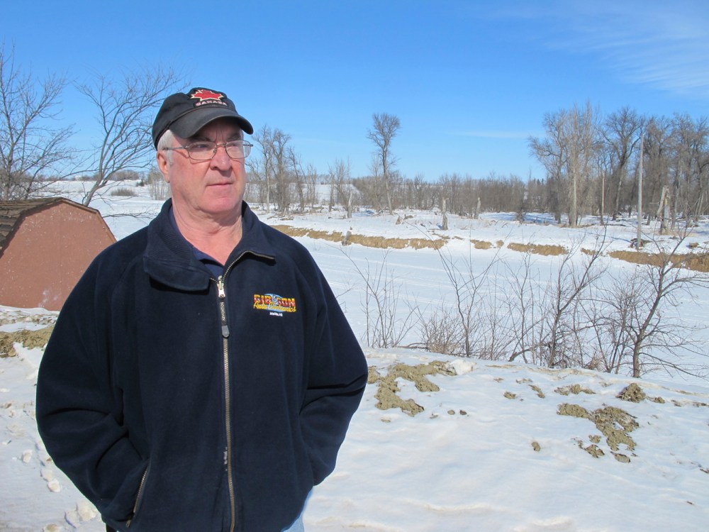 In early March, Melita Mayor Bob Walker stands on a dike raised by the province in 2009 at a cost of $500,000, with the Souris River in the background. He expects his town to be safe but said he's never seen the river this high at this time of year.Tim Smith/Brandon Sun