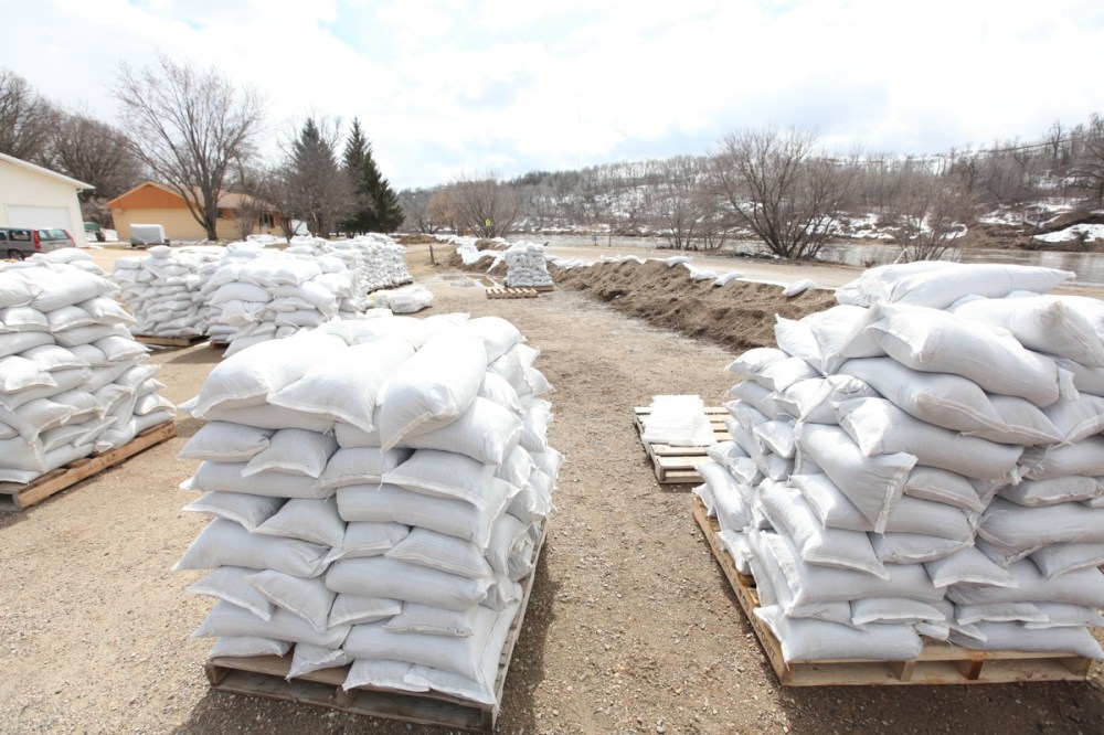 Pallets of sandbags sit in the parking lot Wawanesa School in Wawanesa at the edge of a dike built around the school to protect it from flooding from the Souris river.Tim Smith/Brandon Sun