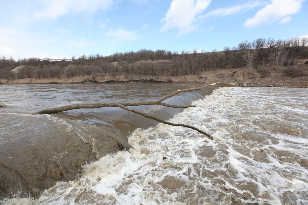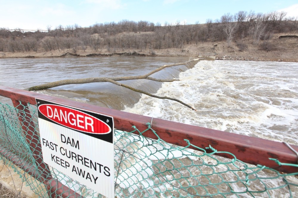 Water from the Souris River rages over the dam in Wawanesa on Monday.Tim Smith/Brandon Sun