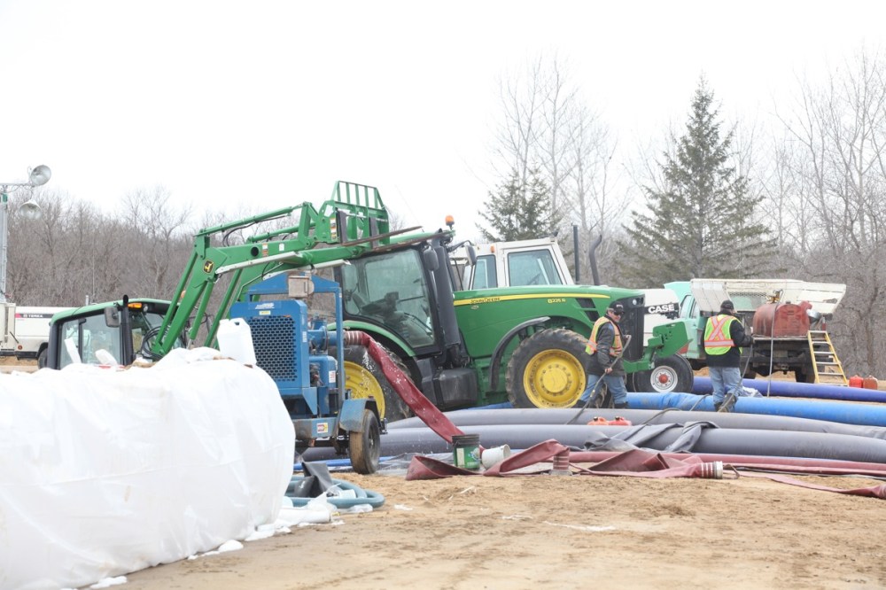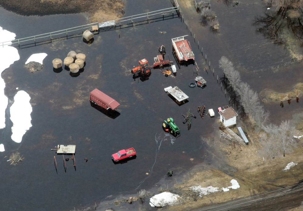 Farm equipment is surrounded by overland flooding at Souris on Friday.Tim Smith/Brandon Sun