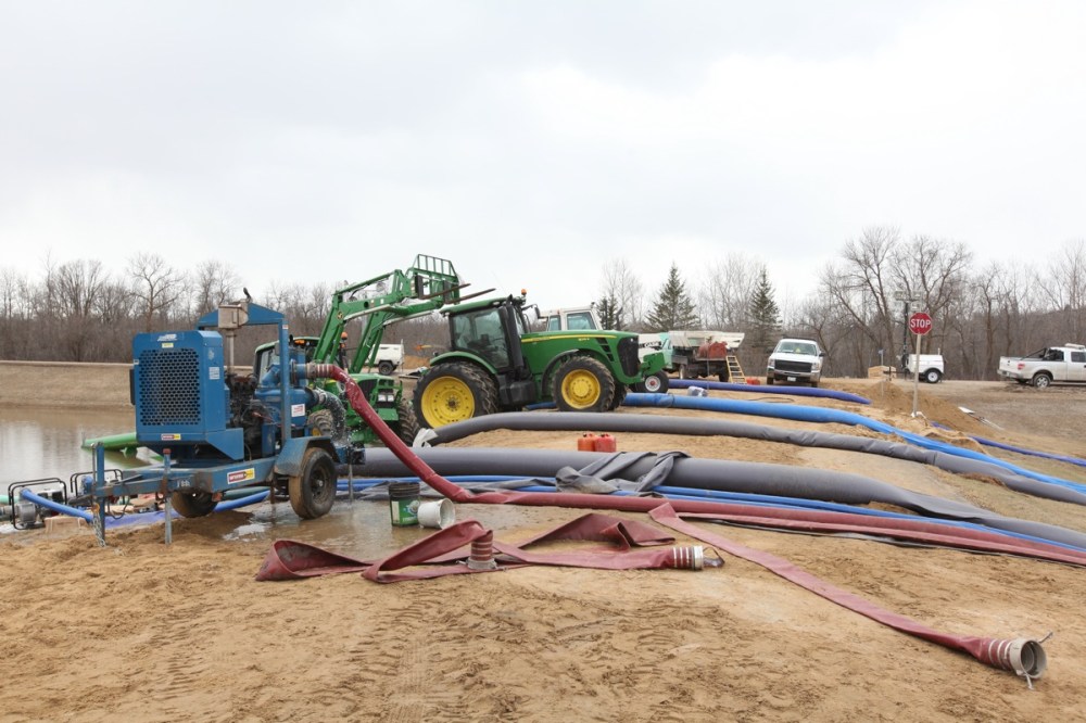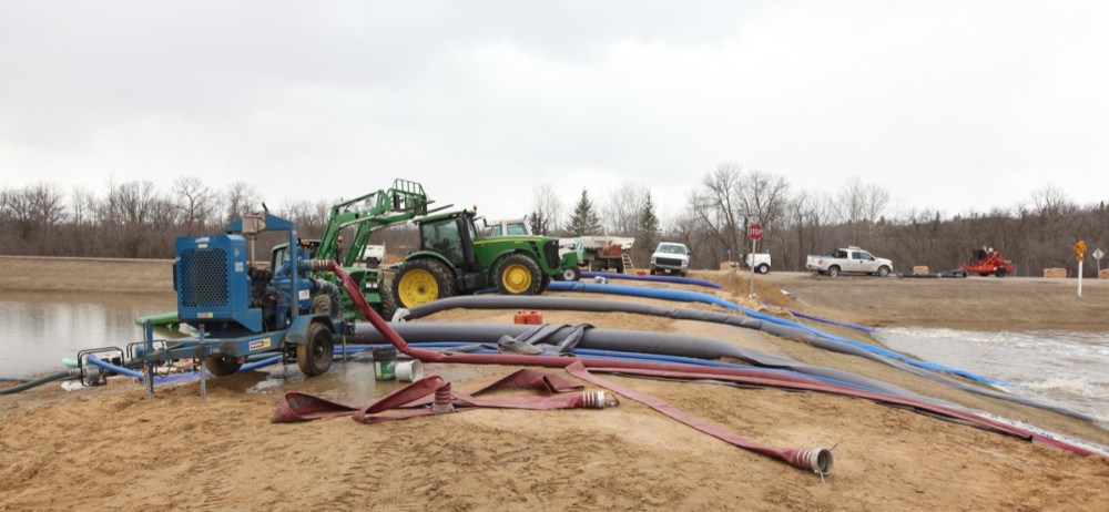 Workers use machinery to pump flood waters back into the Assiniboine River at the edge of the campground road and Highway 5 just north of the Seton bridge over the Assiniboine in Spruce Woods Provincial Park on Monday. Highway 5 is closed between Glenboro and Carberry due to the work being done to deal with the flooding.Tim Smith/Brandon Sun