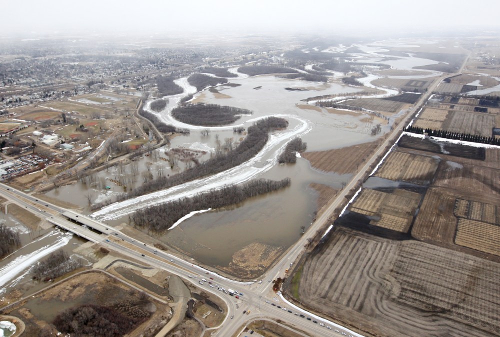 The ice covered Assiniboine River that has flooded its banks into surrounding fields and parks is seen west of the intersection of 18th St. and Grand Valley Rd. (bottom section) on Friday. The flooding has extended to Grand Valley Rd. at 18th St. but would still have to rise quite a bit to flood the road.Tim Smith/Brandon Sun
