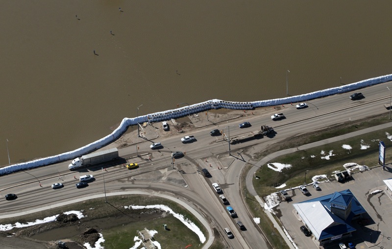 The dike at 18th Street and Grand Valley Road is seen from the air on Monday after a second line of super sandbags was built to reinforce the dike.Tim Smith/Brandon Sun