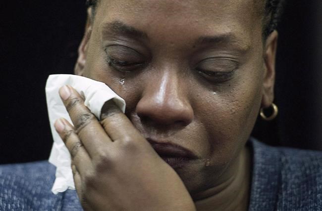 Johanne Coriolan, a family member of Pierre Coriolan, cries during a news conference in Montreal, Wednesday, Feb. 7, 2018. A Quebec coroner says the death of a man in distress at the hands of Montreal police in 2017 highlight a lack of police training in dealing with people in crisis. THE CANADIAN PRESS/Graham Hughes