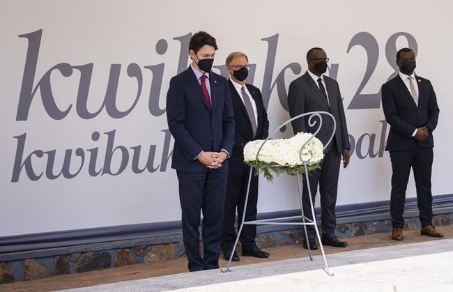 Prime Minister Justin Trudeau pauses after laying a wreath at the Kigali Genocide Memorial in Kigali, Rwanda on Thursday, June 23, 2022. More than 250,000 victims of the Genocide against the Tutsi have been buried in a mass grave at the memorial. THE CANADIAN PRESS/Paul Chiasson