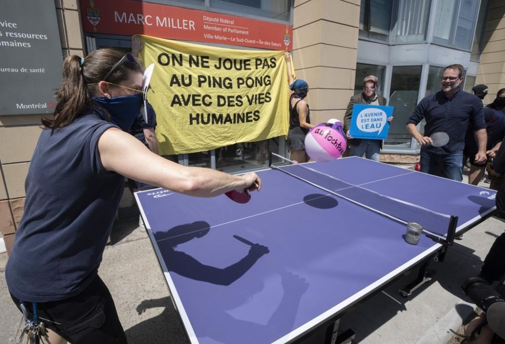 NDP MP Alexandre Boulerice, right, plays ping pong with supporters of the Kanesatake Mohawk community in front of Minister of Crown Indigenous relations Marc Miller’s office to protest the passing of the ball regarding a controversial garbage dump in the territory, Tuesday, May 23, 2023 in Montreal. THE CANADIAN PRESS/Ryan Remiorz