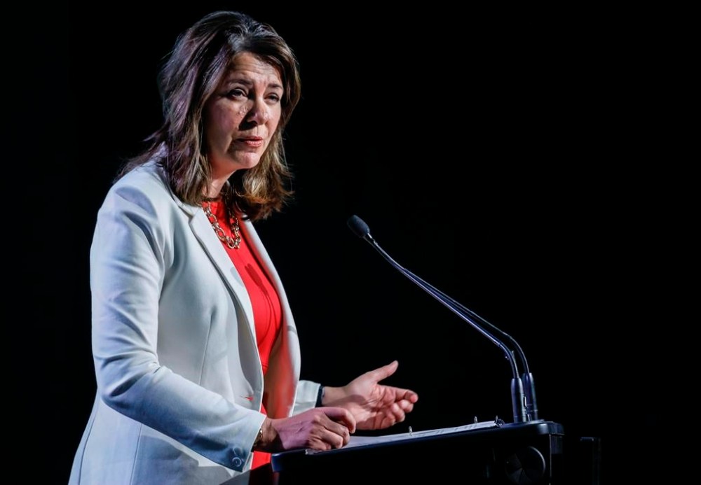 Alberta Premier Danielle Smith speaks to delegates at the Global Energy Show in Calgary, Alta., Tuesday, June 13, 2023. Smith says she’s free to post to Facebook again, a day after she publicly accused the social media giant of censoring her. THE CANADIAN PRESS/Jeff McIntosh