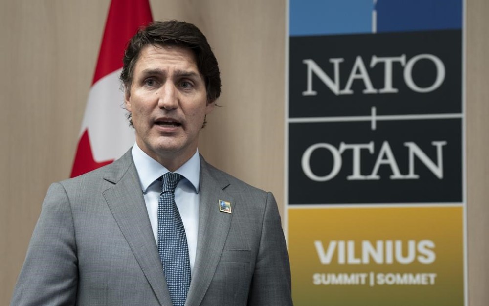Prime Minister Justin Trudeau makes opening remarks at a meeting with Slovakian President Suzana Caputovaat at the NATO Summit in Vilnius, Lithuania, Tuesday, July 11, 2023. THE CANADIAN PRESS/Adrian Wyld