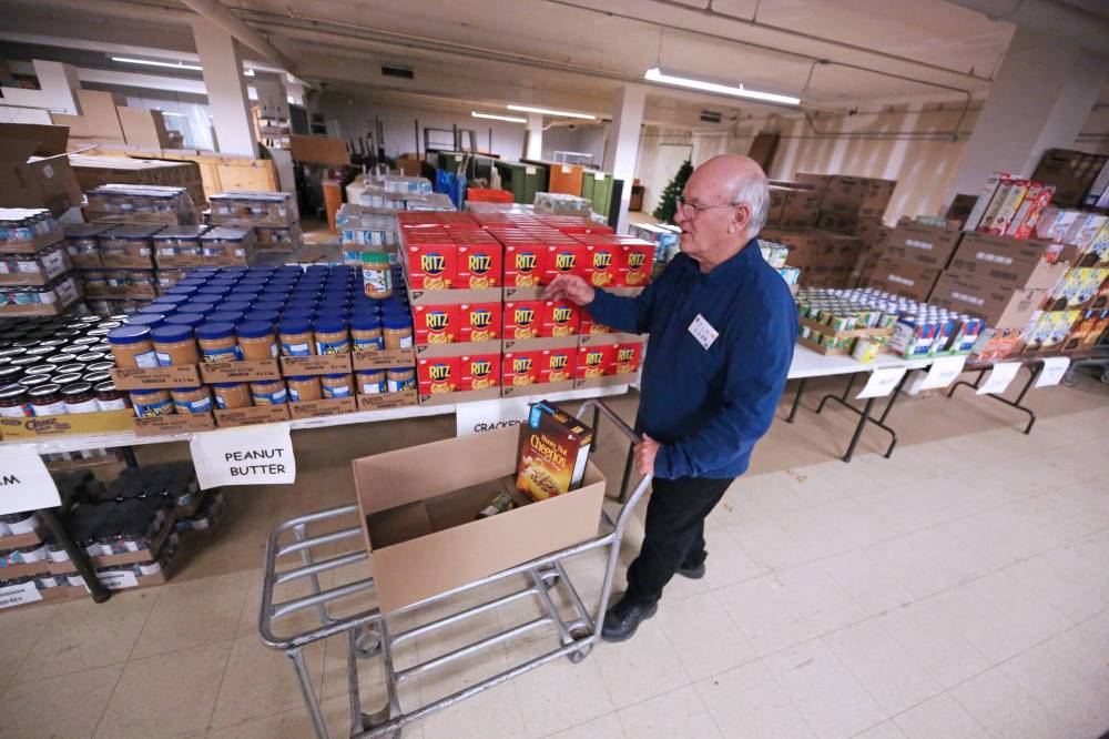 Volunteer Jim Cobb begins packing up Christmas hampers on Friday afternoon at the organization's Rosser Avenue office.