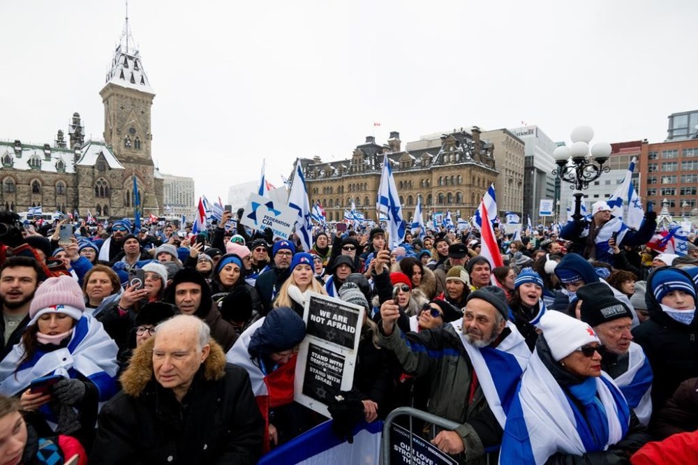 On Monday,thousands of people gathered into a tightly packed crowd on the snow-covered lawn of Parliament Hill in Ottawa. Many of them waved Israeli flags. Nicole Amiel, a spokeswoman for the Centre for Israel and Jewish Affairs, said organizers had brought in about 7,000 people on buses from Toronto and other 2,000 on buses from Montreal.