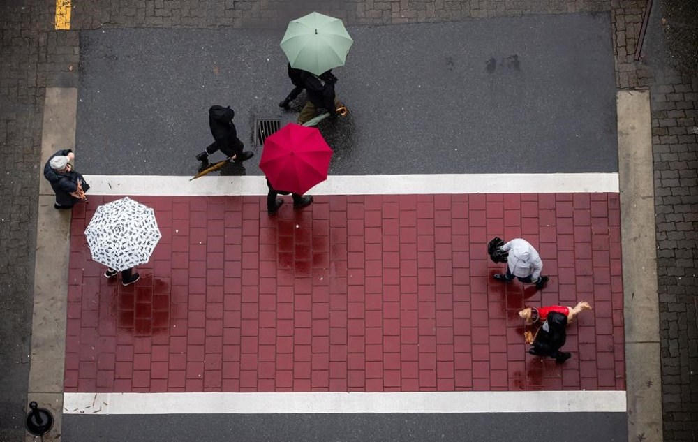 People walk a dog wearing a raincoat as others carry umbrellas while rain falls, in Vancouver, on Sunday, December 27, 2020. Days of heavy rain and snowmelt from record-high temperatures have pushed rivers over their banks, prompting flooding and warnings in southwestern B.C. THE CANADIAN PRESS/Darryl Dyck