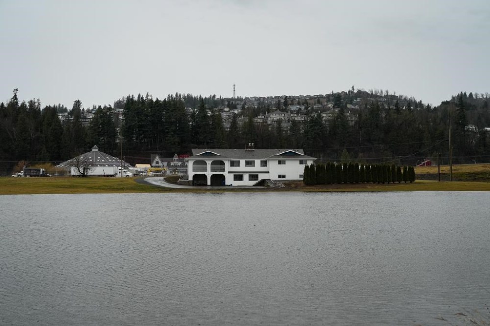 A large amount of water floods a low area of a farm near a house in Abbotsford, B.C., Wednesday, Jan. 31, 2024. A weather system with unseasonable warmth has melted snow and brought drenching rain to the province with temperatures reaching 18C in parts of B.C.'s Lower Mainland this week. THE CANADIAN PRESS/Darryl Dyck