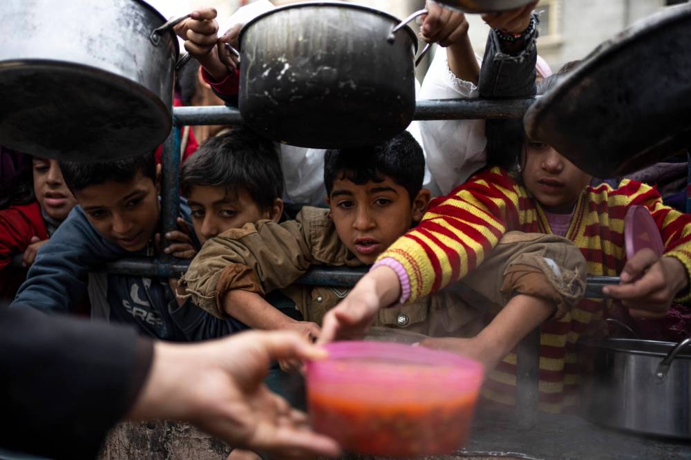 Palestinians line up for a free meal in Rafah, Gaza Strip, on Friday. International aid agencies say Gaza is suffering from shortages of food, medicine and other basic supplies as a result of the ongoing war between Israel and Hamas. (The Associated Press)