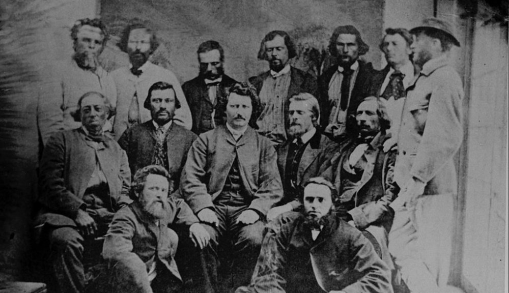 A portrait of Louis Riel hanging in the provincial legislature now recognizes the Métis leader as Manitoba's first premier. 1869 Louis D. Riel - Riel and his Councillors, 1869-1870. Front: Bob O'Lane and Paul Proulx; seated: Pierre Poitras, John Bruce, Louis Riel, W.B. O'Donoghue, Franeois Dauphinais; standing Le Roc, Pierre Delorme, Thomas Bunn, Xavier Page, Andre Beauchemin, Baptiste Tereaux and Thomas Spence (THE CANADIAN PRESS) 1999 (National Archives of Canada/William James Topley) PA-012854