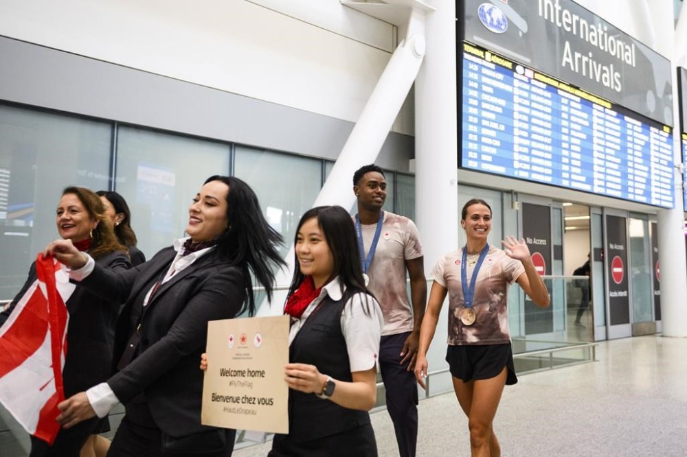 At Toronto’s Pearson International Airport, about 15 Team Canada athletes were greeted by flag-waving airport staff on the tarmac and elated fans and family at the arrivals gate after the Olympians touched down just before 4 p.m.