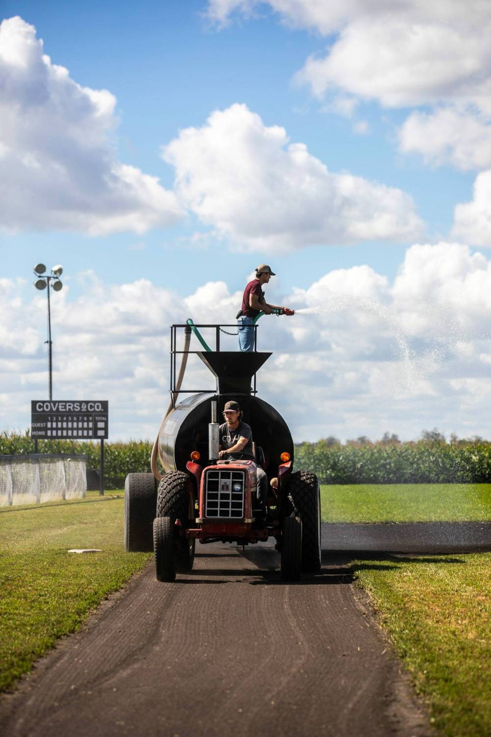 Jace Guilford drags the infield at the Field of Dreams baseball diamond near Clearwater, Manitoba on Thursday. (Mikaela MacKenzie/Winnipeg Free Press)