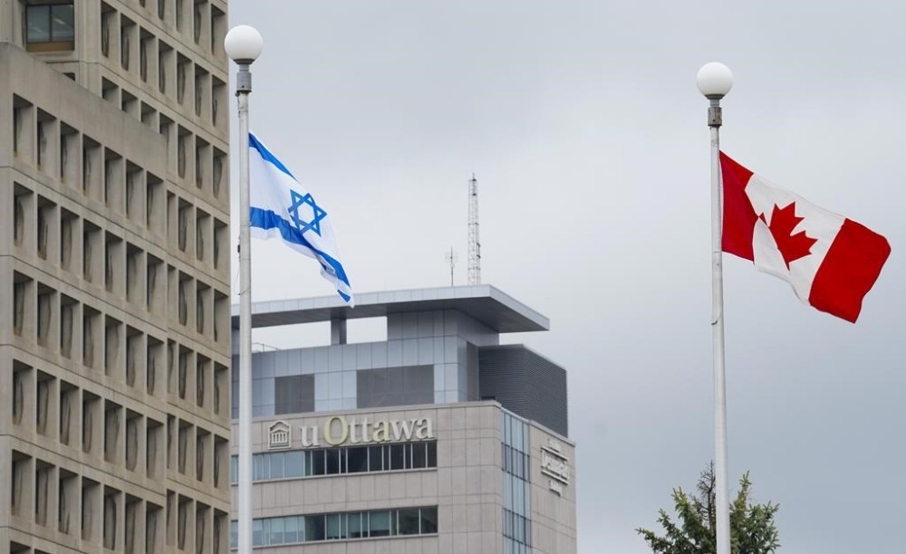 Hundreds of people are gathering today in Ottawa and Toronto to remember the victims of Oct. 7 and the hostages that have not yet made it home. A University of Ottawa sign is pictured behind the Israeli flag as it flies in front of Ottawa City Hall on Tuesday, May 14, 2024. The flag was raised during a private event. THE CANADIAN PRESS/Sean Kilpatrick