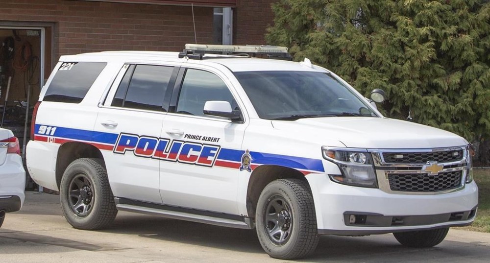 A Prince Albert Police car is seen parked outside a home in Prince Albert, Sask., Thursday, May 13, 2021. THE CANADIAN PRESS/Kayle Neis