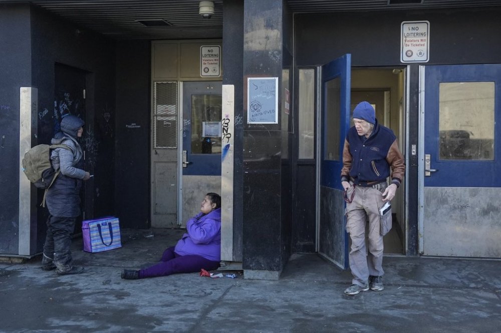 People are seen outside of The Lighthouse, an affordable living centre, in Saskatoon, Sask., Wednesday, April 9, 2025. THE CANADIAN PRESS/Chris Young