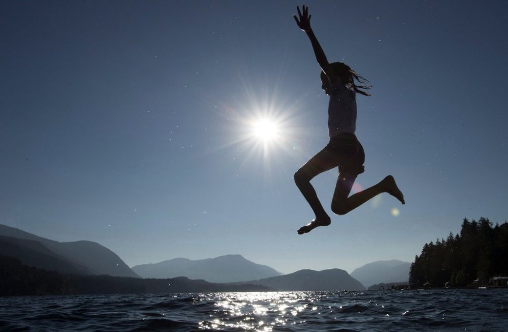 A young girl is silhouetted against the sun as she jumps in the waters of Sproat Lake in Port Alberni, B.C., on Tuesday, Aug. 31, 2018. THE CANADIAN PRESS/Jonathan Hayward
