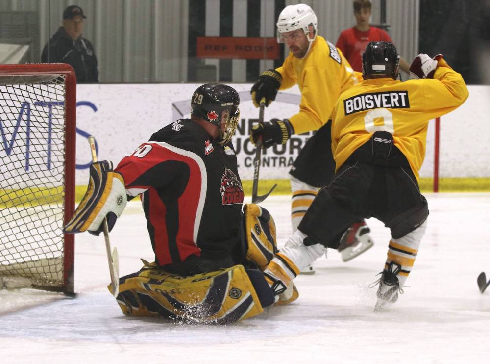 In the alumni game prior to the Manitoba U18 AAA Hockey League matchup at J&G Homes Arena on Saturday evening, Brandon Wheat Kings forward Curtis Brolund shoots the puck just inside the post behind Southwest Cougars goalie Darren Unrau after a pass from Justin Boisvert (9). (Perry Bergson/The Brandon Sun)