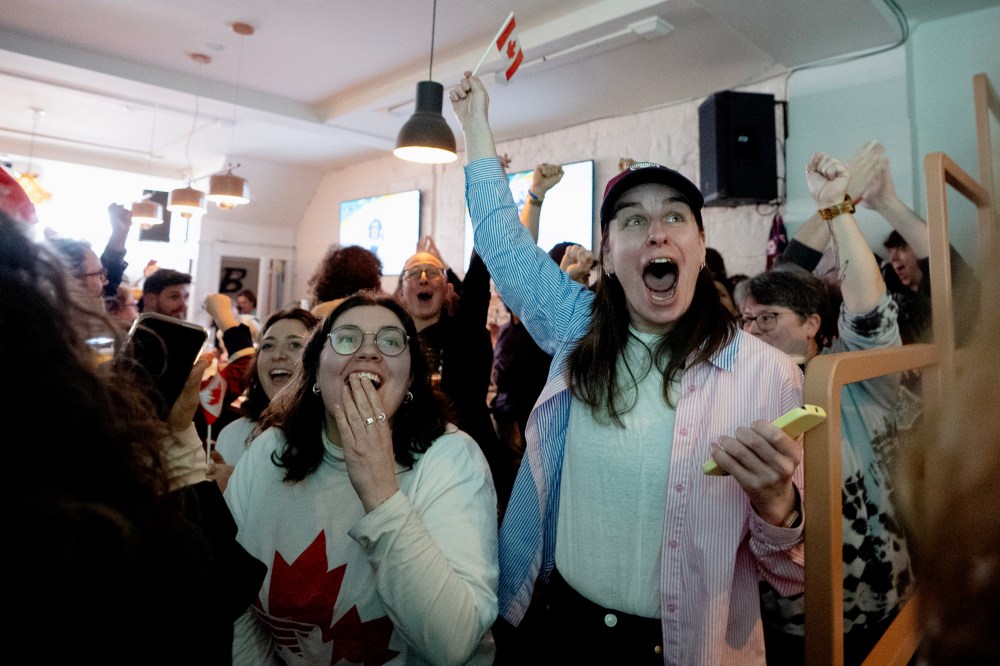 Hockey metaphors such as “Elbows up” have abounded in response to U.S. President Donald Trump’s threats to tariff and annex Canada. In the nation’s capital, chants of “Go Canada Go” broke out among dozens of people gathered at a local Ottawa bar as the game got underway.