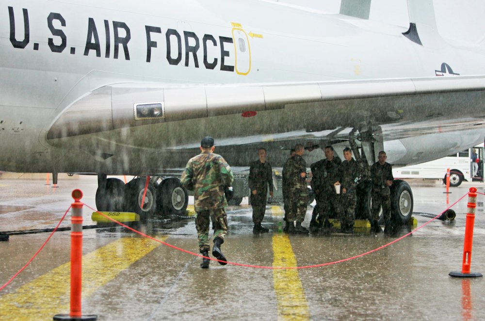 File photo — U.S. air force members stand under the wing of an E-3 Sentry-AWACS aircraft at Tinker Air Force base near Oklahoma City, Friday, June 29, 2007. (AP Photo)
