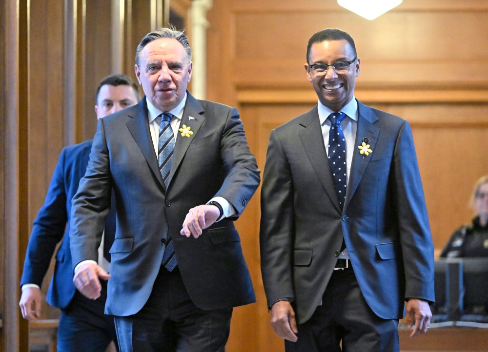 Quebec Premier Francois Legault, left, and MNA Lionel Carmant walk together to question period after Carmant rejoins the government caucus, at the legislature in Quebec City Wednesday, April 1, 2026. THE CANADIAN PRESS/Jacques Boissinot