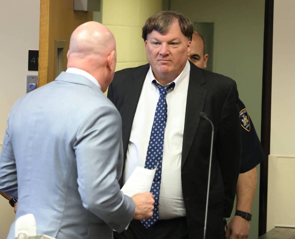 Attorney Michael Brown speaks with Heuermann before he pleads guilty to murdering seven women in a string of long-unsolved crimes known as the Gilgo Beach killings, at a court hearing in Suffolk County Court in Riverhead, N.Y., on Wednesday. (Newsday)