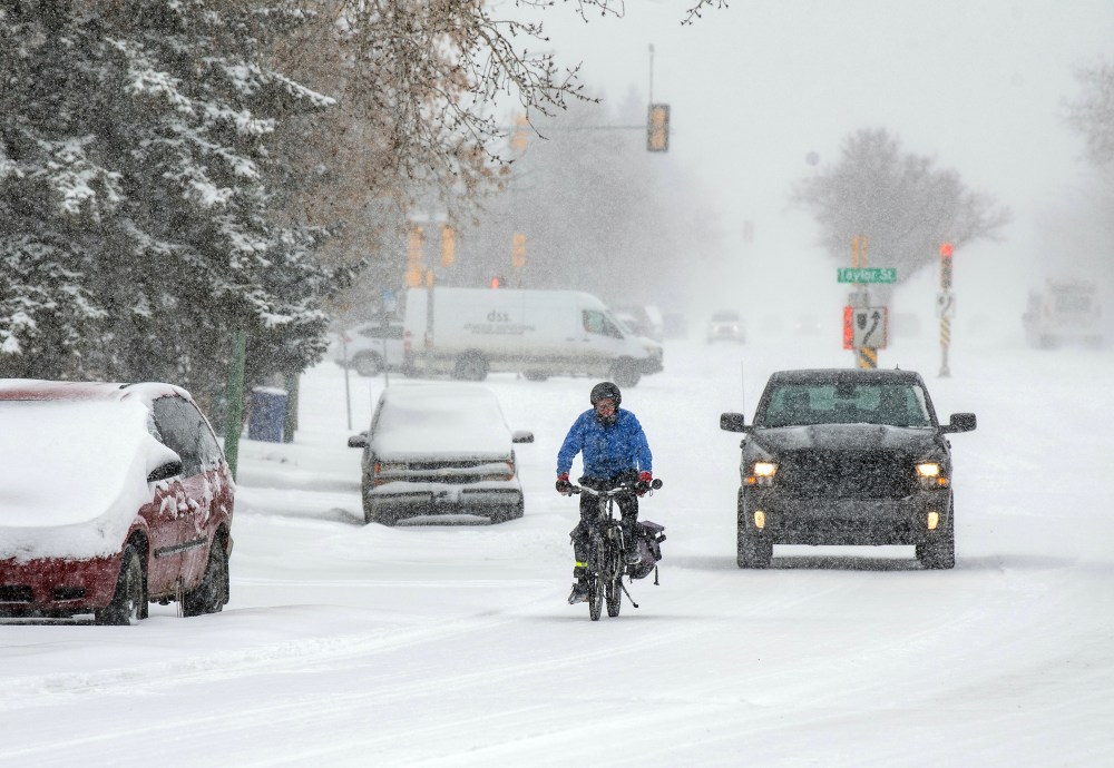 A cyclist braves the roads as a snowstorm hits in Saskatoon on Friday, April 24, 2026. THE CANADIAN PRESS/Liam Richards