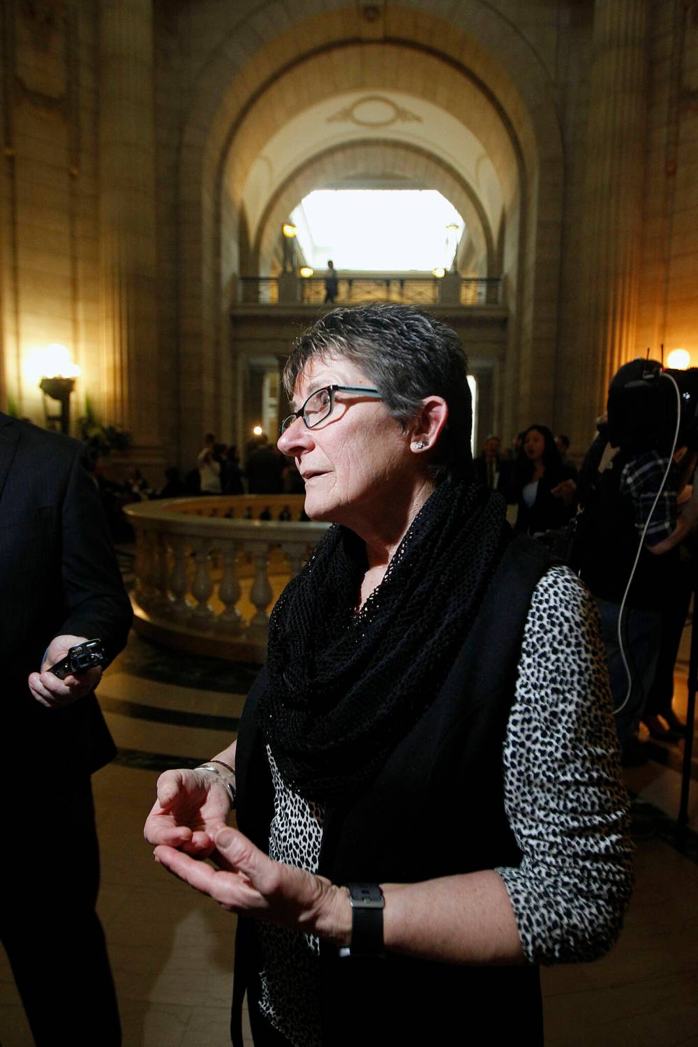 Pat Wege, then the executive director of the Manitoba Child Care Association, reacts to the 2018 provincial budget outside the Manitoba legislature. Wege writes that Manitoba must do better to provide quality child care. (Winnipeg Free Press)