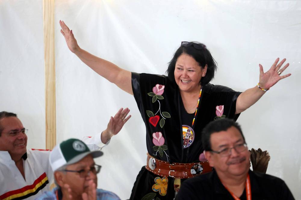 Assembly of Manitoba Chiefs Grand Chief Cathy Merrick celebrates after winning re-election to a second term as Grand Chief on Wednesday. Niigaan Sinclair describes how the relationship between Merrick and Manitoba Premier Wab Kinew seems strained. (File)