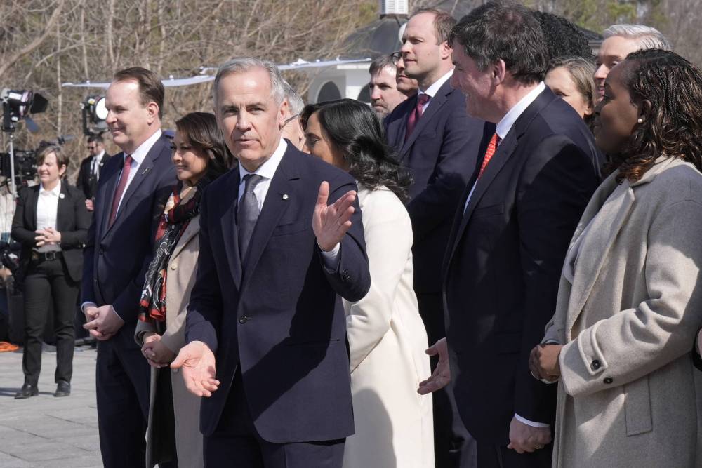 Prime Minister Mark Carney gestures at a press conference as members of his cabinet look on following a swearing-in ceremony at Rideau Hall in Ottawa on Friday. (The Canadian Press)