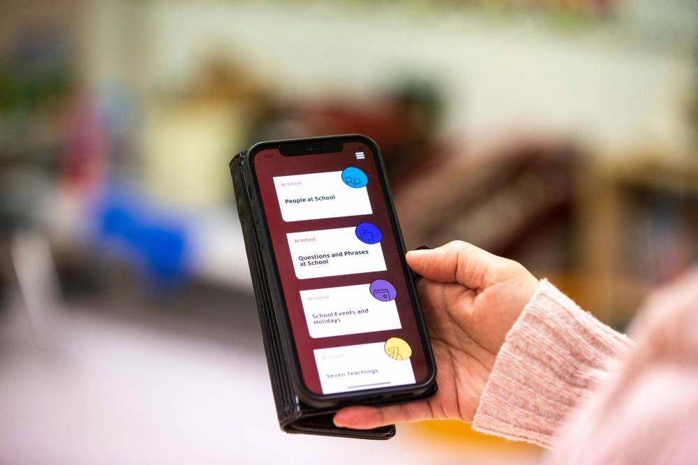 Jennifer Lamoureux, divisional teacher team leader for Indigenous Education in Seven Oaks, shows a new language app at Riverbend Community School in Winnipeg on Dec. 12, 2022. In that case, technology was used to preserve and promote Indigenous language. Now, it’s the development of AI technology that could either destroy or promote Indigenous languages. (Mikaela MacKenzie/Winnipeg Free Press files)